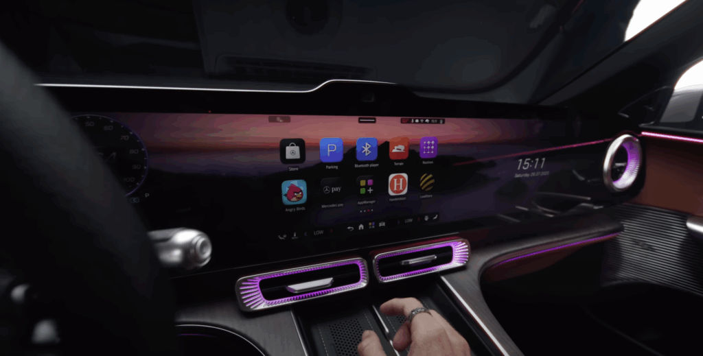 インテリアに足を踏み入れると、ダッシュボード全面を覆う巨大なMBUXハイパースクリーンに圧倒されます。約100センチに及ぶこのスクリーンは、視覚だけでなく操作体験も一変させることを予感させます。最新のMB.OSが統括する第4世代MBUXは、MicrosoftやGoogleのAIを統合し、より自然で直感的な操作を可能に。AI時代に慣れた世代に違和感なく車を操作してもらうことができるでしょうか。また、ゾーンごとに明るさを変えるマトリックスバックライトが採用され、視認性と快適性を両立させる仕掛けも未来的です。