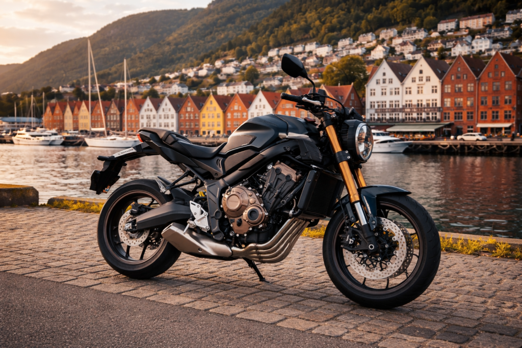 「CB650Rって、派手に語られがちじゃないけど、空気に馴染む力が高いんだよね。ベルゲンみたいな街だと特に効いてくる。